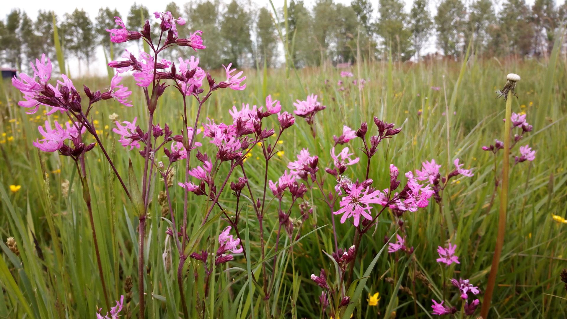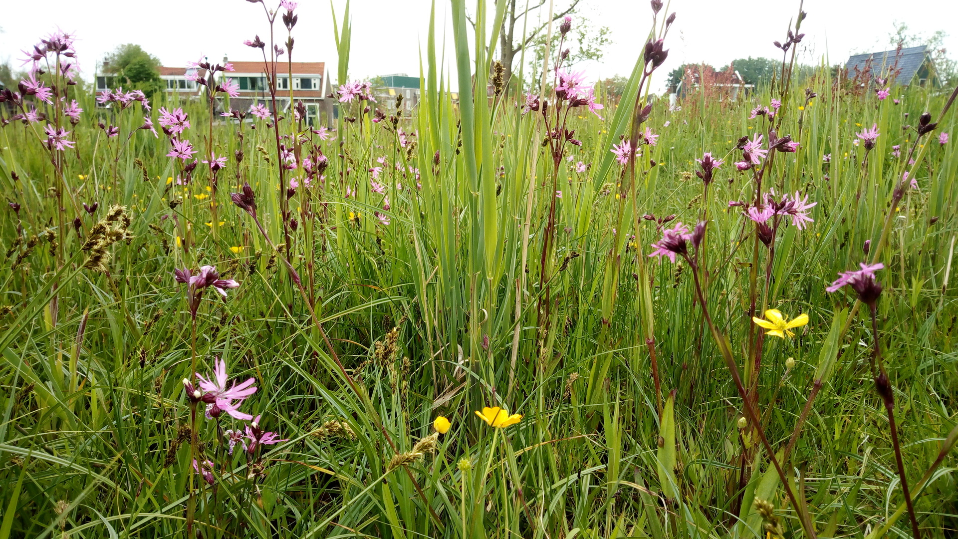 Echte koekoeksbloem samen met scherpe boterbloemen, veldzuring, pluimzegge en diverse grassoorten. Foto van mei 2019, klik voor vergroting.